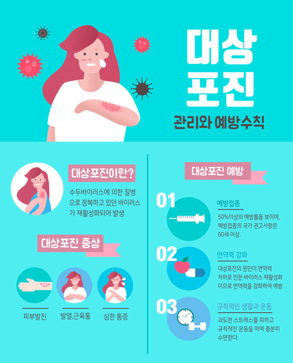 대상포진의 증상이라고 하면 처음에는 피부 두드러기로 오인하는 경우가 많으나 몸 한쪽에 붉은 반점이 한두 군데 나타나면서 통증이 시작된다. 저도 통증이 심해서 진통제를 먹고 참았더니 붉은 반점이 여러곳으로 퍼지고 물집을 뽑을 때 통증이 심했습니다. 내과에 갔을 때 대상포진 진단을 받고 일주일 정도 주사와 진통제를 맞고 통증이 완화되었고, 면역력과 체력이 약해지는 계절에 대상포진 주의보가 발령됩니다. 대상포진은 수두 바이러스가 체내에 잠복해 있다가 면역체계가 약해지면 다시 활성화되면서 발생하는 질병이다. 면역력이 약한 중장년층에서 주로 나타납니다. 미국 감염병학회(Infectious Diseases Society of America)에 따르면 60세 이상 인구의 대상포진 연평균 발생률은 1,000명당 6.5~16건으로 전체 발생률(1,000건당 3.15~5.25건)의 3배입니다.
